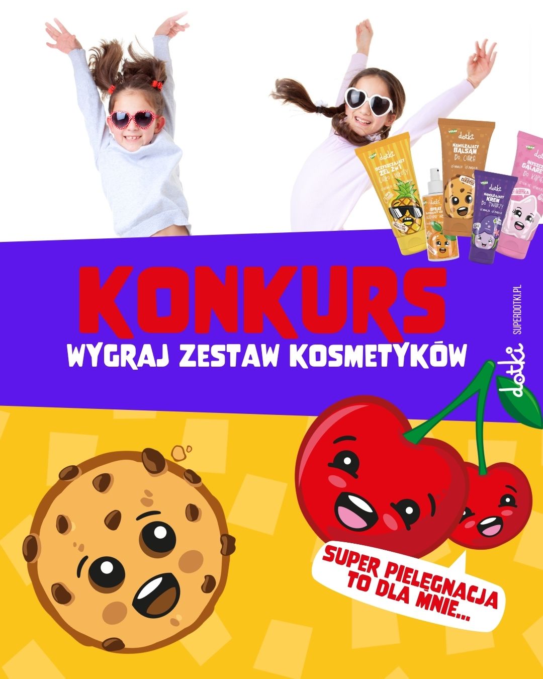 - Nagrodami w konkursie jest: 1 zestaw kosmetyków – Jedna nagroda to Zestaw kosmetyków Dotki, składających się z Oczyszczający żel 2w1 do kąpieli ciało i włosy Ananasek, Nawilżający balsam do ciała Ciastek, Nawilżający krem do twarzy Elfik, Błyszczącej galeretko do kąpieli 200ml, Sprayu do rozczesywania włosów 150 ml. W konkursie zostaną nagrodzone 3 osoby.